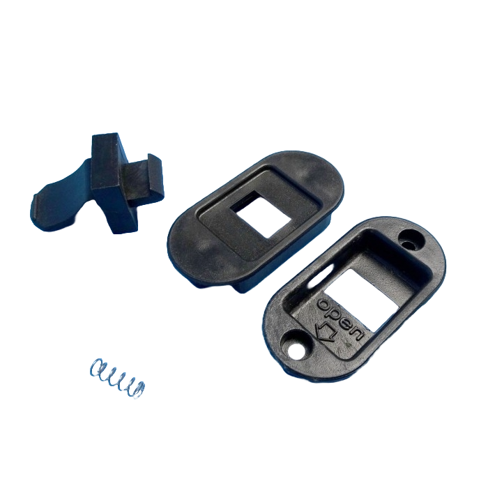 Black plastic retainer clip suitable for older style Aussie Traveller doors. Includes 4 pieces and comes assembled. Excludes female receiver piece (sold separately).